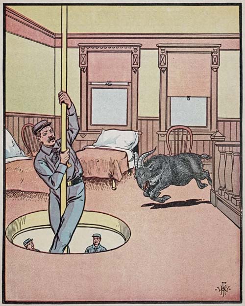 “I don’t know,” answered the gentleman, “goats are queer creatures. Mr. Windlass, what will you take for him? I have been looking for a big jet-black billy-goat to lead my flocks for a long time. The wolves are getting pretty bad out West on the range and a goat makes a good leader. I want a black one, as his color would distinguish him from the white sheep immediately. Besides, your goat[18] has other points in his favor; he is strong, large, a good fighter you say, and has long, sharp-pointed horns. Name your price and I will take him and have him shipped West in the same car with my horse when I go. I will charter a car and put feed in one end of it and have the other partitioned off into two stalls into which I will put the goat and horse.”