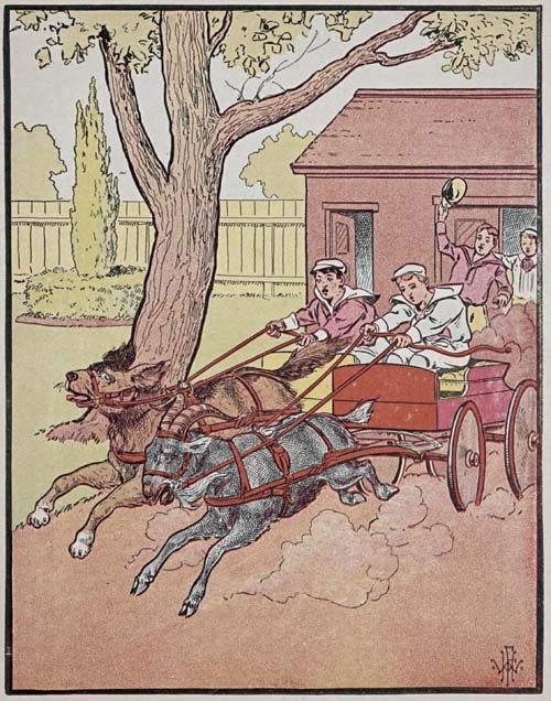 [132]The next morning Billy and Stubby kept out of sight until the fisherman had loaded his wagon with fish, vegetables and his turtle, and had started on his way to town. Then they ran out of their hiding place and followed him, taking great care to keep out of sight and in this way they soon came to the seaport town and followed him down to the wharf. When they reached the town they both walked under the wagon so that people would think that they belonged to the fisherman and would let them alone.
