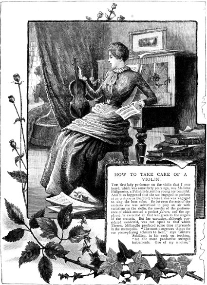 In the preservation of a good violin it is requisite that it should be kept, when not in use, in a wooden case, lined with cloth or flannel; and as it is subject to damage from the sudden changes of the weather, the greatest care should be taken to keep it from damp. Too great heat, however, will often render the wood brittle, and make it difficult to produce the tone with the best effect, as the strings are apt to become dry, so that it is not easy to bring out that delicacy of tone which is one of the charms of the instrument. To carry the violin to any distance from home in cold weather, it should always be put into its case, or else it is apt to condense moisture when brought into a warm room, and to cause dust to accumulate both inside and outside of it. And it should never be left out of its case in the summer, as the flies are almost certain to get into the f holes, and leave their filth in it, much to the detriment of its tone. It is also absolutely necessary to keep the violin perfectly clean; and the resin-dust should be carefully wiped off with a soft linen cloth before and after using it. It is a good plan to insert a handful of warm barley into the interior, through the f holes, and by shaking it well the dust will attach itself to the seed, and will be brought out with the barley through the f holes. This process should be performed twice a year, and the instrument will be better preserved for it. To keep the strings on the instrument in good order for any length of time, take a small piece of taffeta and moisten it with almond oil, and rub it lightly over the strings, from the bridge to the nut, after using the violin, and before putting it into its case. And when you want to use it again, wipe off the oil with a piece of fine linen. This plan is especially beneficial to the fourth or G string, which, however much it may be stretched before being covered with wire, is apt to shrink in summer, when the wire gets loose if the string is not subjected to the oiling. The advantage of adhering to this plan will be that the strings will not become dry, and will retain a smoothness of tone, and keep the moisture from the fingers from being detrimental to the strings, and prevent their producing a false tone, or that grating or whistling so common in the use of the resin from the bow. This treatment of the instrument was communicated to Ernst by Otto, and Ernst mentioned it frequently to the professors and amateurs, who readily adopted it and found considerable advantage therefrom. The proper means of preserving strings not in immediate use is stated to be the moistening them with the best almond oil, putting them into a piece of calves’ or pig’s bladder, and enclosing them in a tin box. Most violin players know where to procure the best strings. Another important thing connected with the violin is its having a paper bridge fitted for it, which should be specially adapted to the instrument. If the performer has a good violin, there will be no difficulty in procuring a good and proper bridge for it when it is required. And the next thing to having a good bridge is that of having a good set of pegs for tuning the violin. In Germany girls are taught to play the cornet, the French horn, and various other wind instruments; but whether it would be decorous for our females to imitate such examples is rather doubtful. It is by constant use, and not by age only, that a violin becomes mellow in tone; but a great deal depends on the maker. It is true that Cremonas and other violins which have been in constant use for many years have acquired a character for superiority beyond most others, consequently they often fetch a larger price—more, perhaps, from having been in the possession of first-rate performers than from any intrinsic value in the instruments themselves. It is not our intention, however, to give any account of the manufacture of the violin—those who are curious in such matters may consult a thousand other works on the subject, which are to be obtained of the music publishers, both foreign and English.