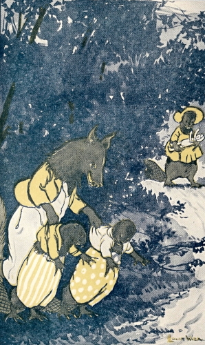 Then about a thousand birds that were going South to spend the winter where it was warm and sunny, came flying along, and they fluttered all about that wolf, and they pricked him and nipped him all over, from the tip of his nose to the tip of his tail, so that the wolf was glad enough to run back to his den and let Toodle alone.