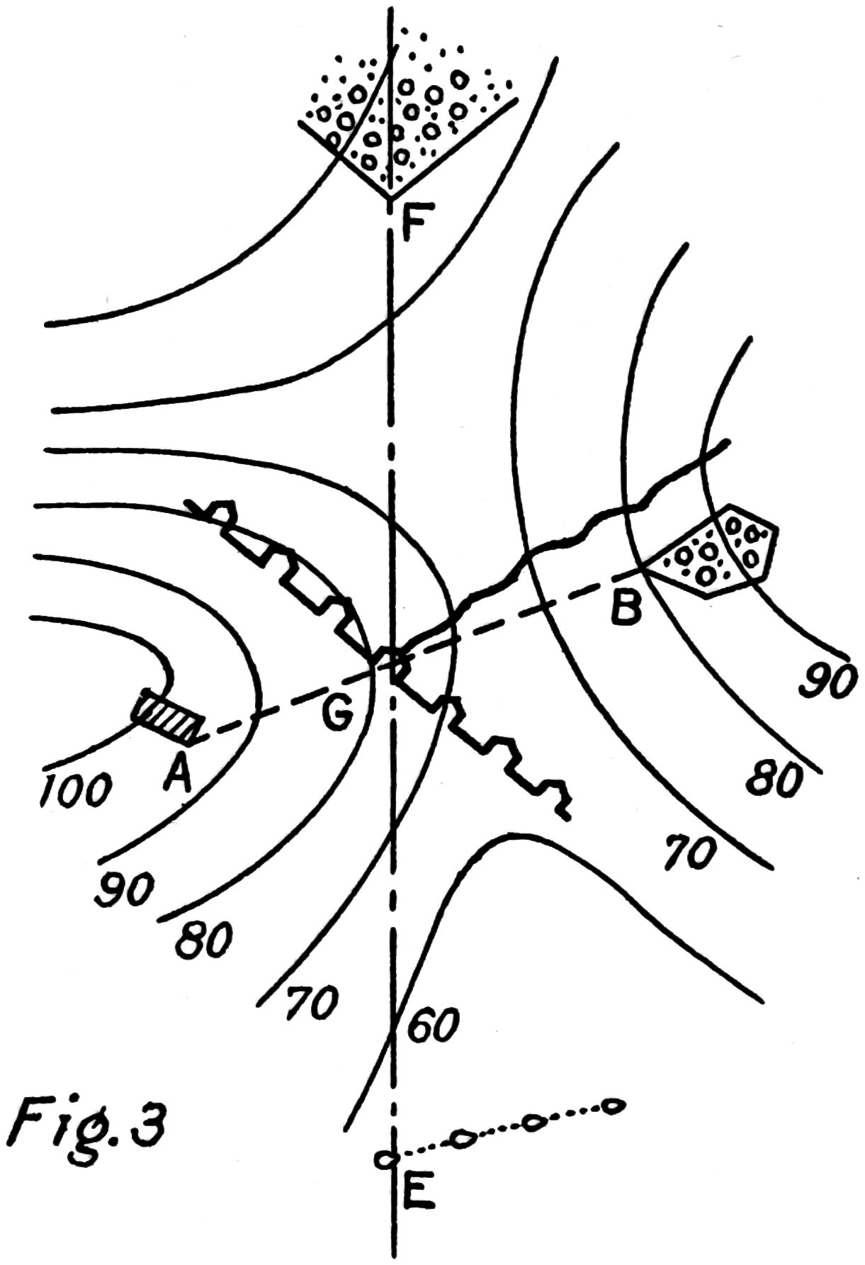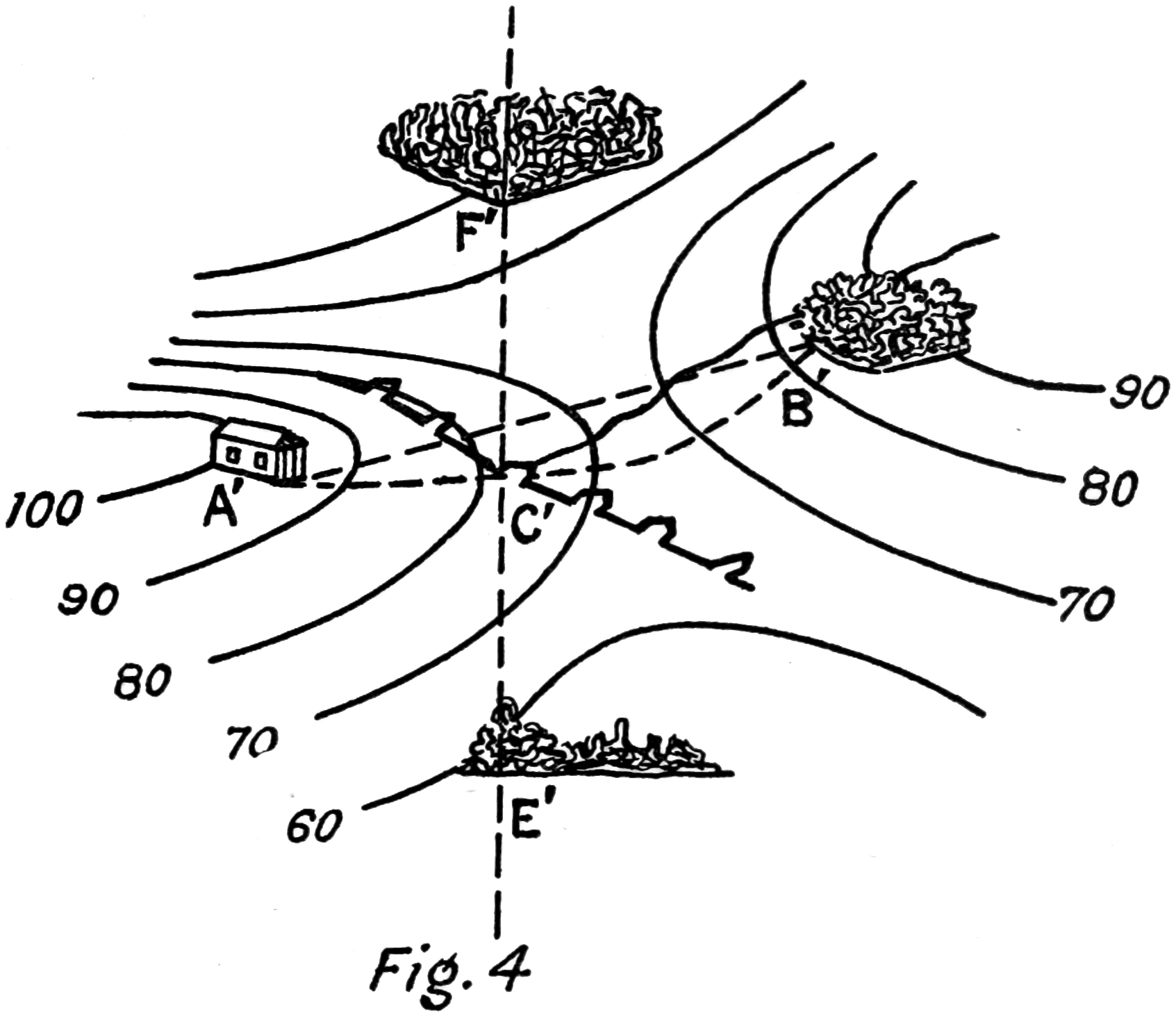 Example (fig. 3).—On the map C is the objective, A and B two points so situated that the line AB passes through C, and EF the direct alignment, or the line balloon objective. The line AB coincided on the terrain, with the trace of the vertical plane passing15 through A and B. In oblique vision (fig. 4) it is different. The line A′C′B′ is a curve which follows the irregularities of the ground, and the point C′ is not on the oblique alignment A′B′.