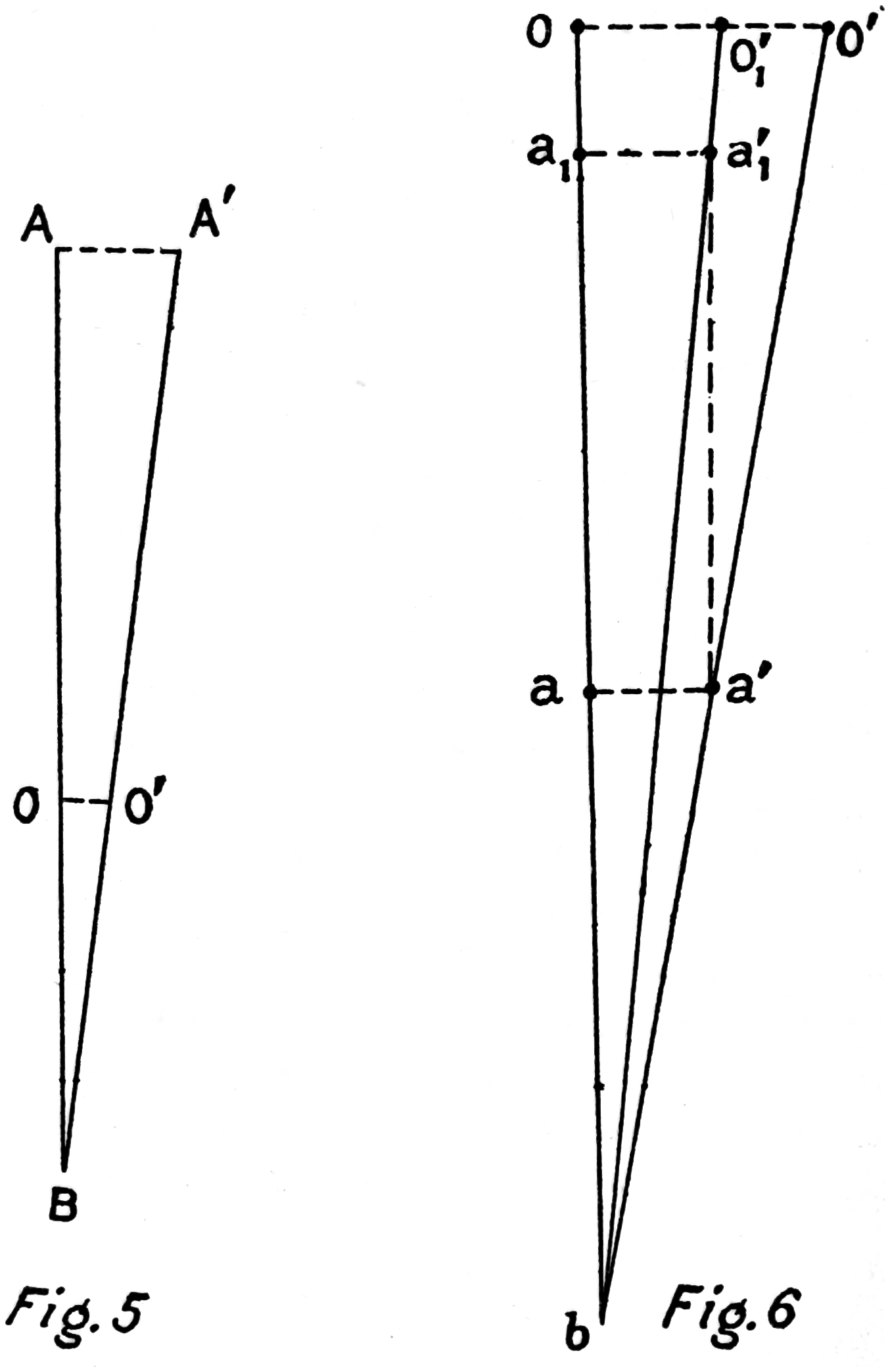 Thus (fig. 5), two reference points A and B determine the alignment AB, O, the objective, is situated at some point between A and B. An error AA′ in the spotting of one of these points leads to a smaller error in the position of the objective OO′—that is, smaller than AA′.