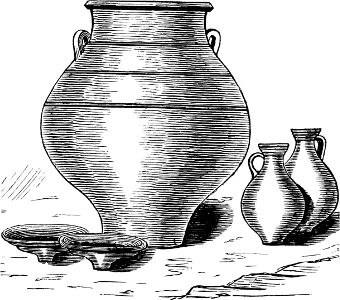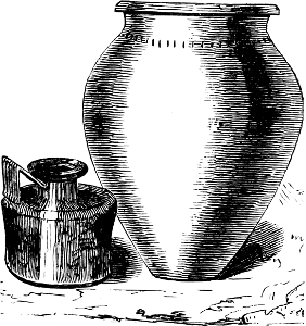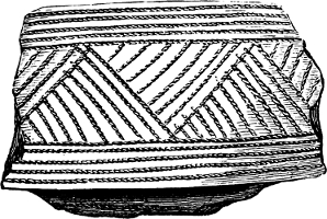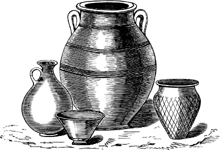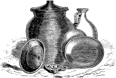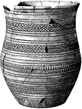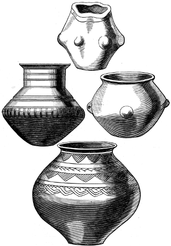 The pottery exhibits considerable difference, both in clay, in size, and in ornamentation. Those presumed to be the oldest are of coarse clay mixed with small pebbles and sand; the later ones of a somewhat less clumsy form, and perhaps a finer mixture of clays. They are entirely wrought by hand without the assistance of the wheel, and are mostly very thick and clumsy. They are very imperfectly fired, having probably been baked on the funeral pyre.