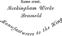 [116] These teapots were of high and somewhat peculiar form, like what are now usually sold as coffee pots, and were universally known as “Rockingham Teapots.” This high form was said to be the reason of the tea being produced of a better quality than in the ordinary shaped ones.