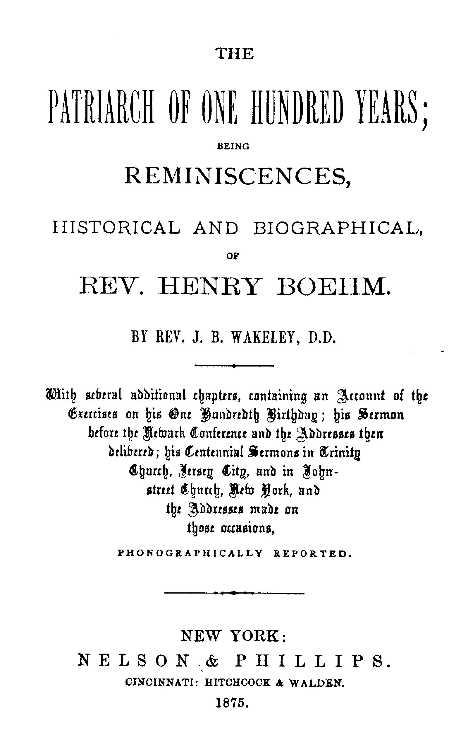 On the morning of Sunday, June 27, 1875, Father Boehm preached his centennial sermon in the Methodist Episcopal Church in John-street. It was a notable event, and among the congregation memory and imagination were both busy with the associations and thoughts suggested by it. When he preached what was called his centennial sermon before the Newark Conference, in the preceding April, he had not quite completed his one hundred years; but now he was a genuine centenarian, and the interest of the occasion was heightened by the place in which he preached his real centennial sermon. His first visit to the old church, which stood on the present site in John-street, was made in company with Bishop Asbury on the 7th of May, 1809, of which he wrote: “What thoughts crowded my mind as I entered this cradle of Methodism! What rich and hallowed associations cluster around this original home of Methodism on this continent!”